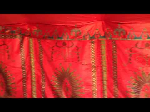 De Blacktent 7x14 is een Pakistaanse weddingtent. De grote broer van de 6x12. Vaal zwart van buiten en diep rood van binnen. De combinatie van ruig zwart canvas en een warme satijnen interieur geeft de tent echt karakter. Wij vinden hem vooral ‘stoer’. Of een oriëntaalse nachtclub. Het is een spantent die rust op drie stalen masten en wordt uitgespannen doormiddel van scheerlijnen en haringen/pennen.