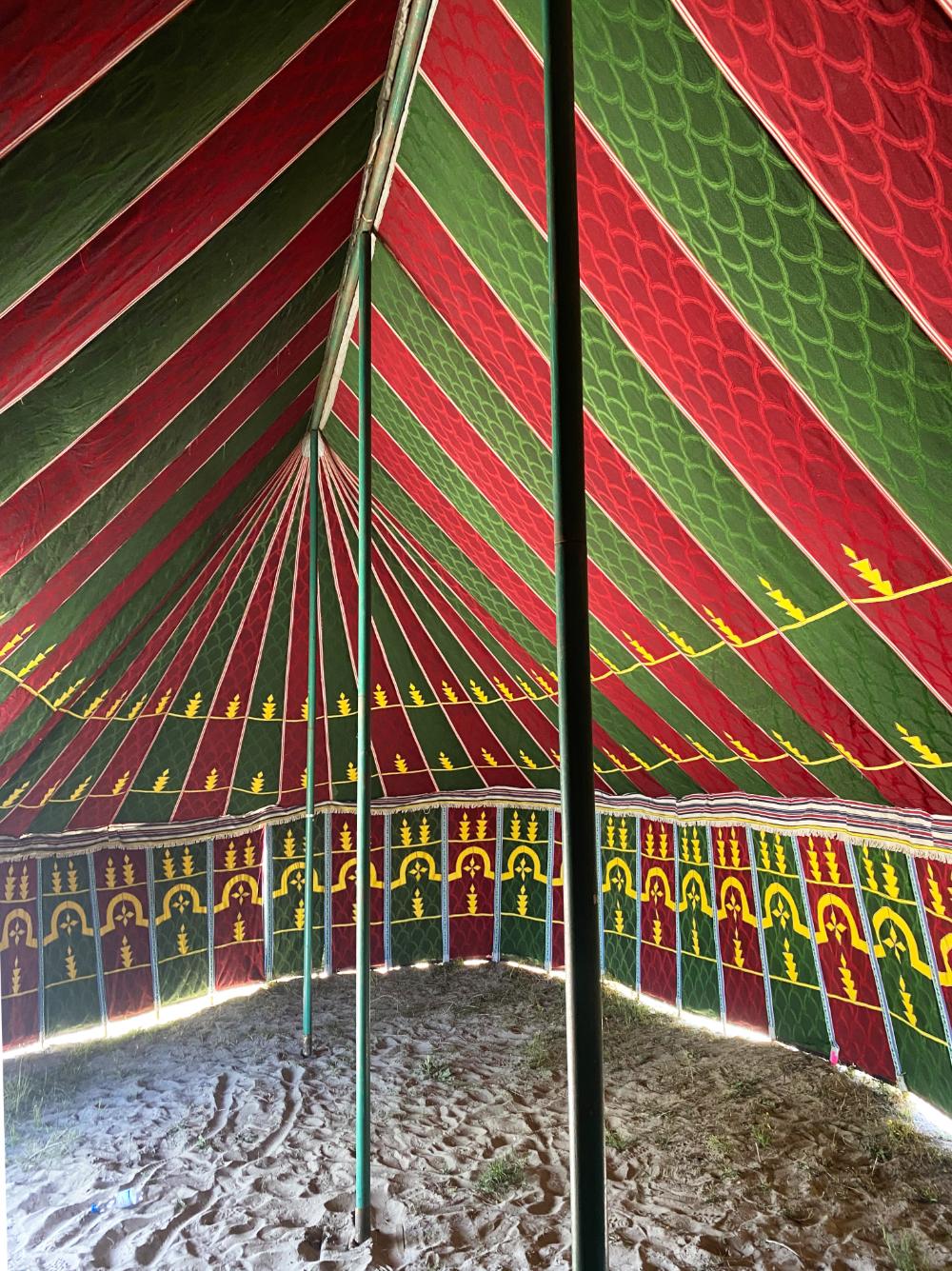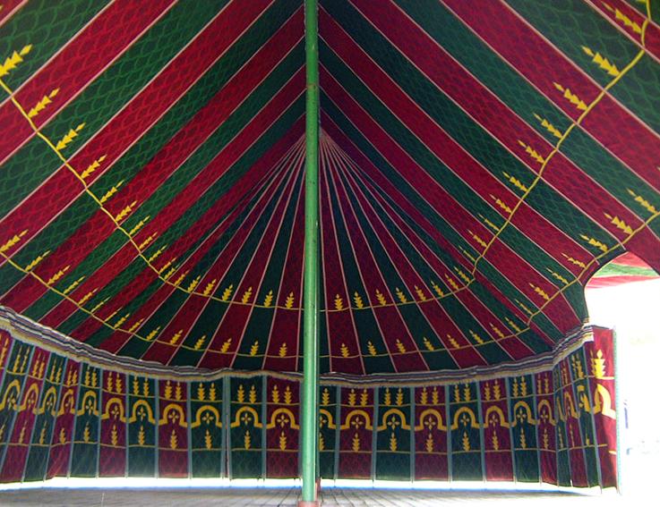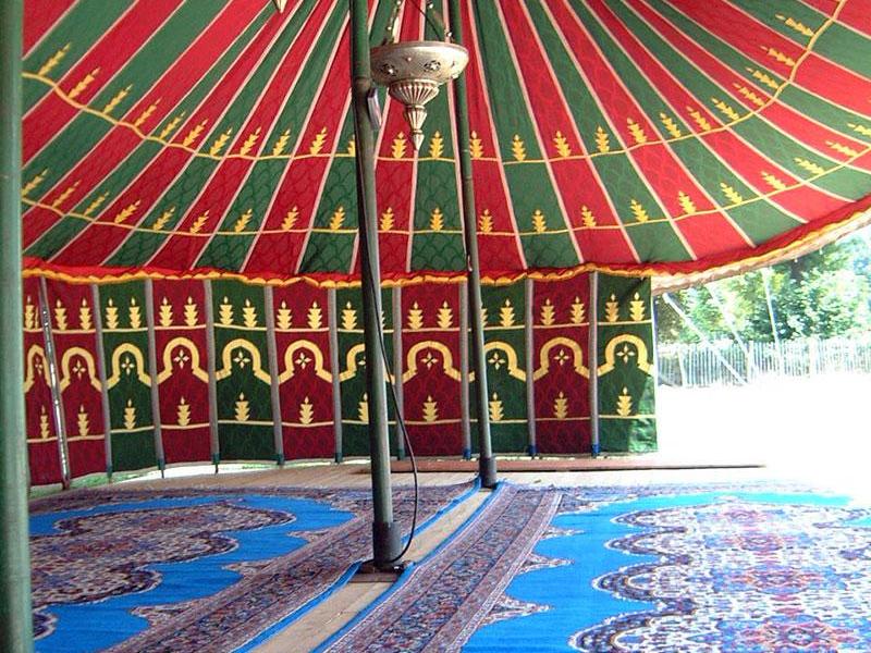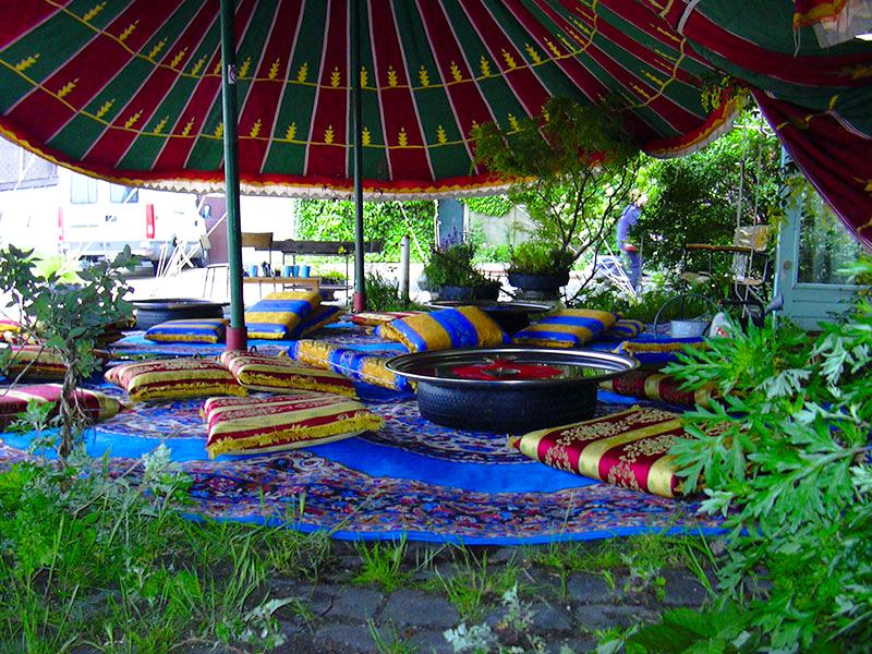 De kleuren rood (macht), groen (islam), en geel (rijkdom) reflecteren de Noord-Afrikaanse trots. De masten worden geaccentueerd met koperen piekornamenten. Met bamboe brengen we de inloop wat omhoog voor een goede doorloop.