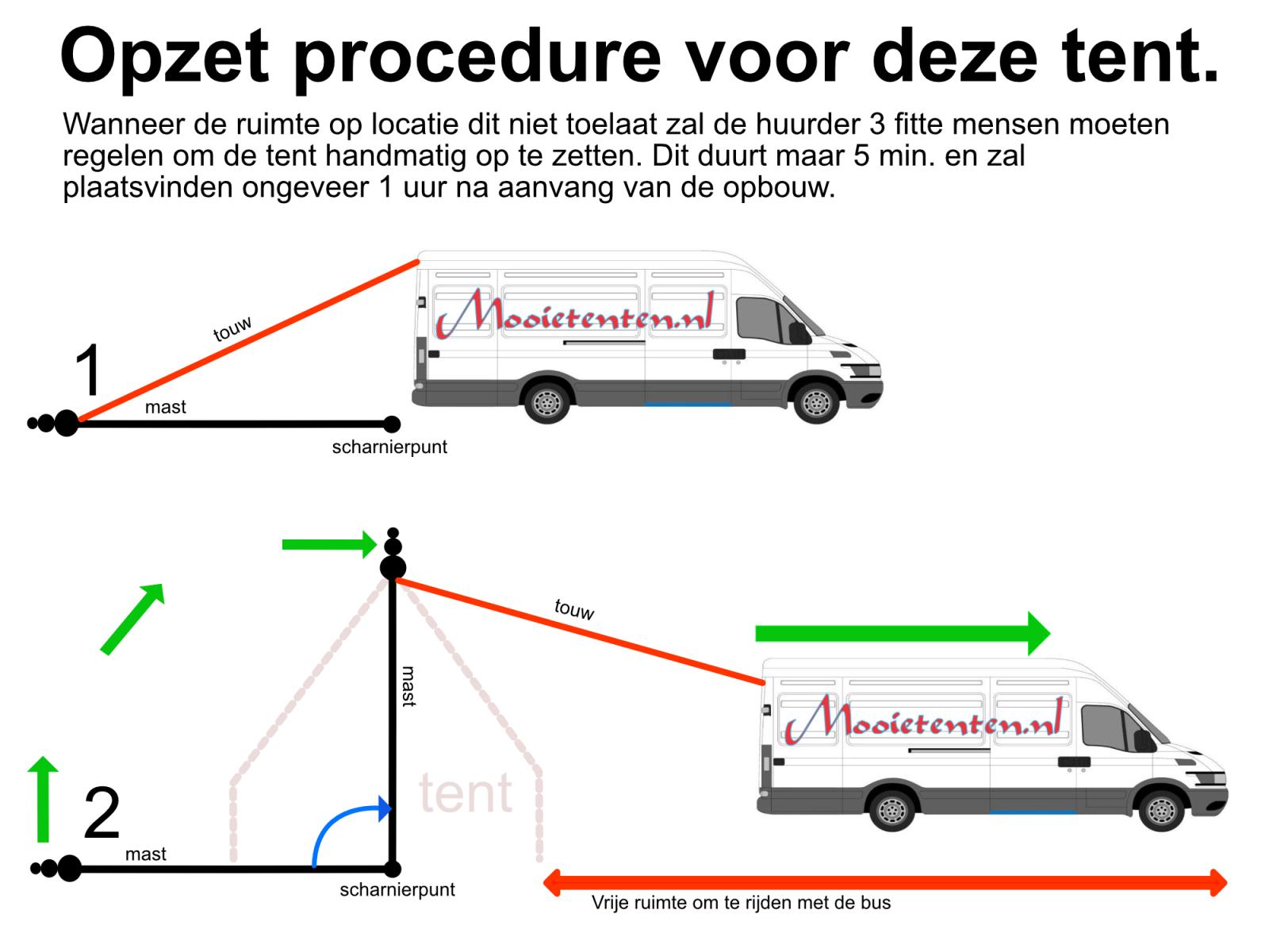 - Aantal ingangen: de tent heeft 1 hoofd ingang, er kunnen er meer gemaakt worden