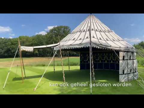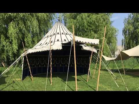 De tent HazaraH is een prachtige traditionele Marokkaanse tent. Dit soort tenten werden daar veel gebruikt door het nomadische Caïdale volk om door de sahara te trekken. De tent is van buiten versierd met traditionele patronen. Afgetopt met een geel koper geslagen piek-ornament. Het interieur heeft een diep donkerblauwe hoofdkleur met gele patronen. Het is een spantent, welke rust op een stalen paal. De tent wordt uitgespannen doormiddel van scheerlijnen, bamboe en haringen/pennen. De HazaraH en de Dakhla zijn qua maat, vorm en opbouw mogelijkheden identiek. Dus kijk even op de zuster-pagina voor meer foto's. De tenten kunnen geheel gesloten opgebouwen worden maar ook op een meer open manier zodat de tent betere in en uitloop eigenschappen heeft. Let op! de opzetmaat is significant groter dan het tent oppervlak.